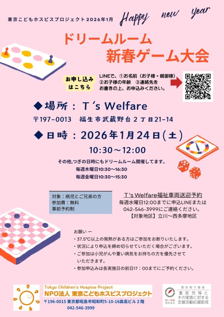 東京こどもホスピス2026年1月17日(土)10:30〜11:15T’s Welfare2026年1月24日(土)10:30〜12:00詳細はチラシ画像をご覧ください。